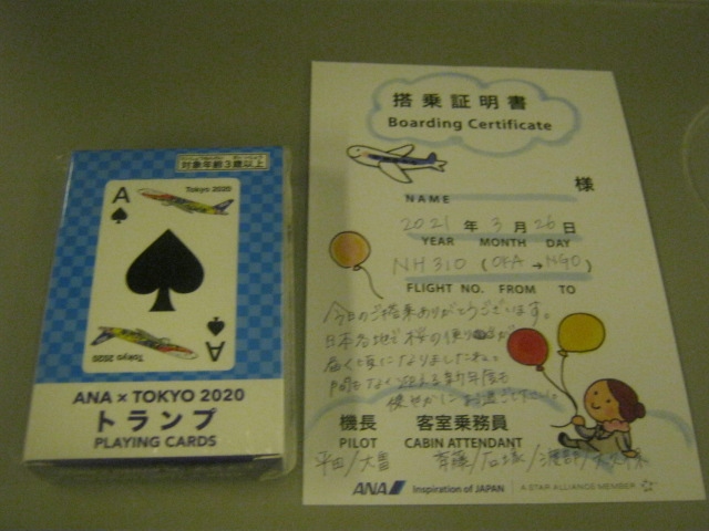 続くCTS-OKA、最後のOKA-NGOに関しては、こちらから暇なときで結構なので、という申し出の中で、同じように搭乗証明書をお願いしたのですが、前者では記念のステッカーと、後者では何と東京五輪バージョンの記念トランプと共に、持って来て下さいました。