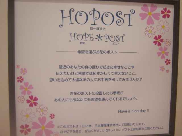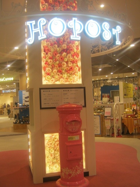 イオンとしての特徴は他とあまり遜色ない感じですが、ここで面白いなと思ったのは、HOPOSTと呼ばれるピンクのポストです。フードコート脇のエスカレーターを2Fに上がってすぐの所にあります。普通のポストとして郵便物の投入が可能なのですが、HOPOSTとは、HOPEとPOSTとを併せた造語のようで、ポストの周囲には美しい花々も飾られていて、”希望を運ぶお花のポスト”とのことでした。