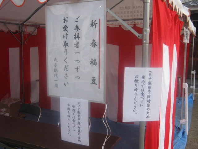 私は早朝参拝でしたので貰えませんでしたが、翌三日の昼頃に母が参拝した際、毎年恒例の福豆は頂くことができたそうです。ただ、やはりその場では食べるなと言われたそうで、”テイクアウト”にてお家まで持ち帰ってきました。