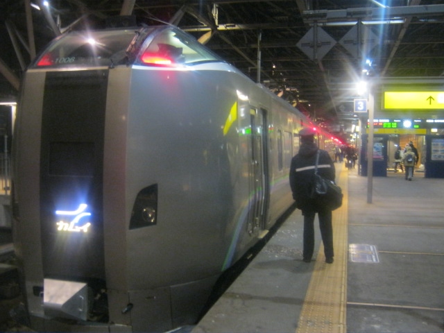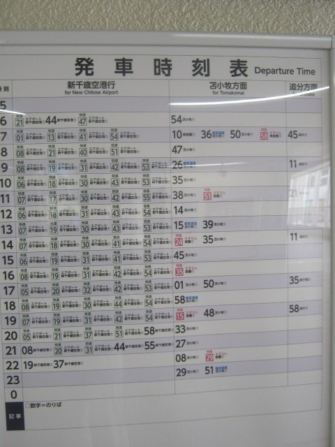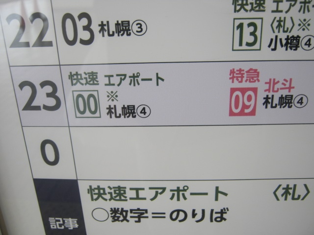 で、今回は特急自由席が利用できるピーチのフリー切符利用だったので、敢えて千歳→札幌という短い区間でこの特急に乗車したのですが、流石に快速エアポートと数分しか所要時間が変わらないのに、通常だと特急料金がかかってしまうこの乗車行動が不審に思われてしまい、駅員さんに「特急ですけど大丈夫ですか?」みたいな嫌味(?)を言われるのもまた味わい深いですね。逆に上りでスト、千歳から室蘭方面に向かう特急利用のお客さんは多いので、不審な眼で見られることは少ないですが…(;´Д`)。