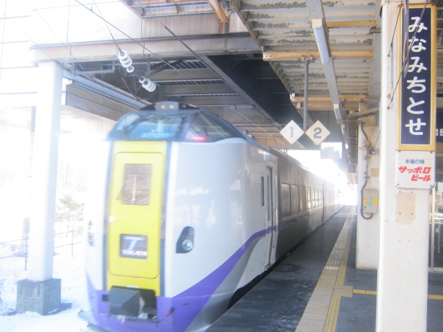 今回は、「すずらん」の特殊性(?)により注目して、千歳市内に宿を取っていたこともあり、敢えて南千歳ではなく、千歳から乗車してみました。北斗は基本的には千歳に停まらない(例外的に夜間の最終下り北斗のみ、南千歳から新千歳空港に向かう接続列車がもうないために、南千歳は通過し、千歳に停車というスタイルになっていますが…)ので、基本的に千歳駅から特急に乗る場合には、「すずらん」しか選択肢がありません。(「すずらん」しか停まらない駅は、他に室蘭傍の幌別駅や鷲別駅も挙げられます。)