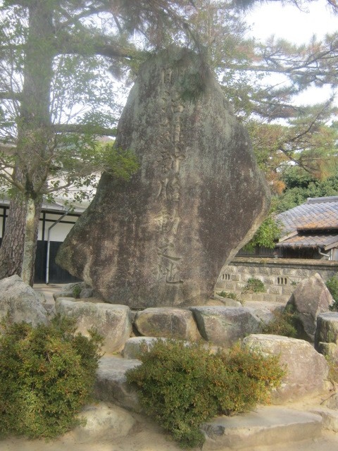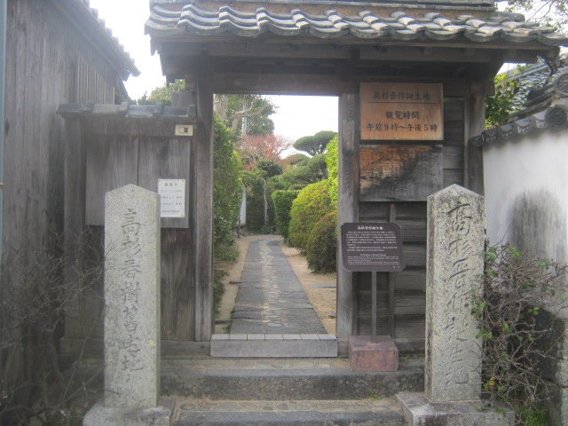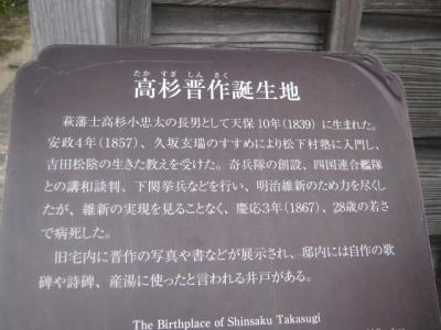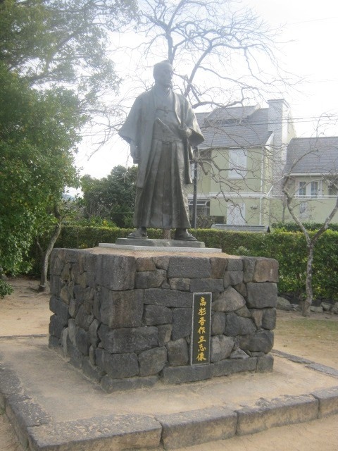 高杉晋作生誕地のすぐ傍の小公園南西側にひっそりと建っている像です。生誕地側からアクセスすると丁度公園の入口は行ってすぐ右手に見えますので、迷うことはないのですが、注意すべきは、慶安橋筋(南側)から小門をくぐってアクセスした場合です。