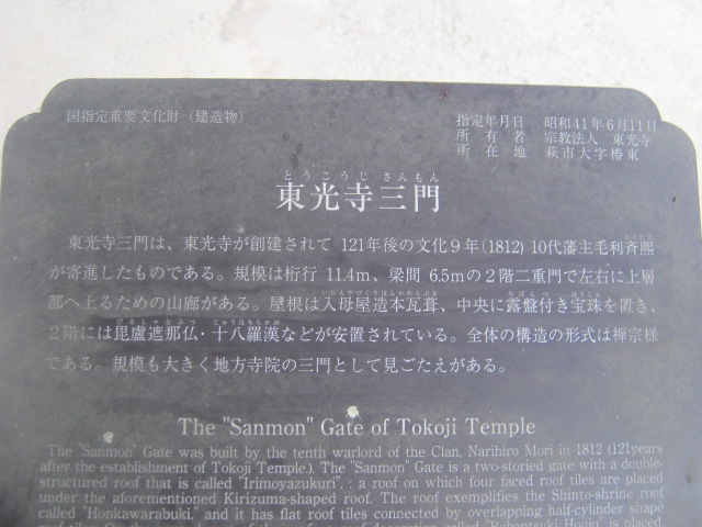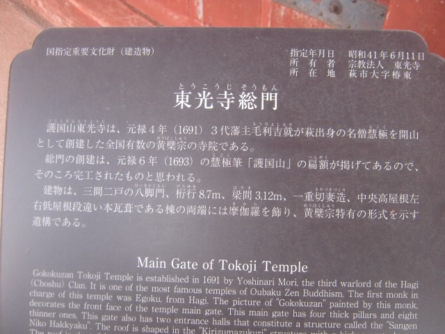 観光地が数多く点在する萩の中では、相対的に目立ちませんが、私が見た中での萩のお寺の魅力としては、このお寺が一番だと感じました。訪問に際しては、萩循環まぁーるバスに東光寺前というバス停があり、ここを下車してすぐのところに総門が見えます。- 旅行時期