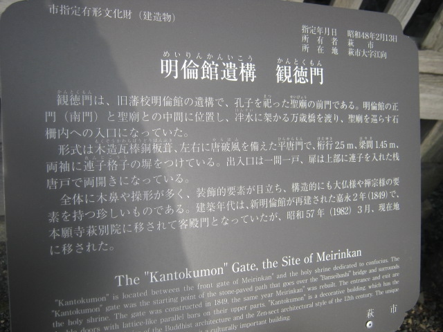 萩・長州藩の藩校として知られていた明倫館(現在の明倫学舎がある場所とは別の場所)ですが、この門もオリジナルの場所より、昭和の後期になってから、現在の明倫学舎の建物のある南東側へと移築されています。門としての機能が失われて、単に眺めるだけになっているスタイルは少々残念ですが、装飾的要素を多く持つ優美な門として、見物する価値は高いように思われます。