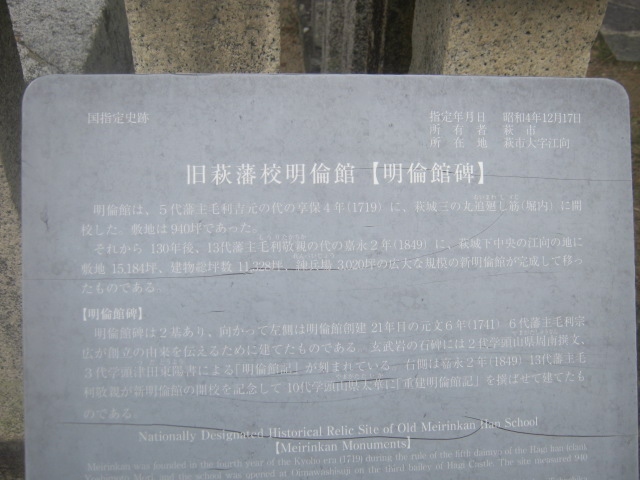 現在は、萩・明倫センターとして、新山口駅に向かうスーパーはぎ号の発着場の一つにもなっていて、一観光客視点からは、高速バスで萩入りした際の観光の拠点にすると良い場所です。本館は無料で見学できますが、パネル展示が多くて、結構一つ一つを見ていくのは大変です。2号館は有料の300円となっていますが、本館を見るだけで手一杯に感じる方も多い内容だと思います。個人的に注目したのは建物前に建つ二つの石碑で、それぞれ6代藩主、13代藩主の時代に業績などを刻んだ明倫館碑として、国指定史跡となっていますので、こちらも是非お見逃しなく…。