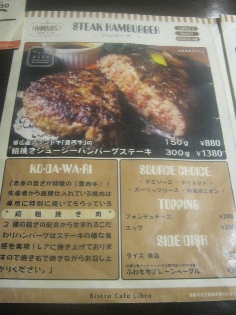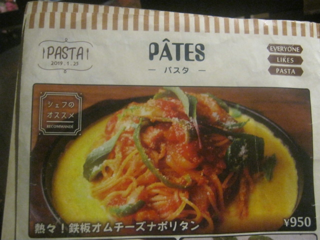 メニューとしては、ハンバーグやステーキが一番人気のようですが、私はそんなにがっつりと食べたい気分でもなかったので、オムチーズナポリタンというパスタ系のメニューをオーダー(1045円)しましたが、熱々で寒い冬の旭川で頂くには最適でした。それ以外にもピザなどは割と安く頂くことが出来ます(800円程度)。- 旅行時期