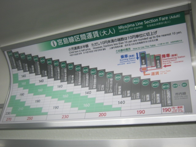宮島線のみの運賃は対キロ運賃となっていますが、市内線を通しで利用する場合はどこまで乗っても270円で利用できます。市内線だけの乗車の場合は190円の均一運賃で、宮島線と通しで乗った場合の差額は80円しかありませんので、宮島線を絡めた乗車はよりお得感があるかなと思います。