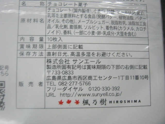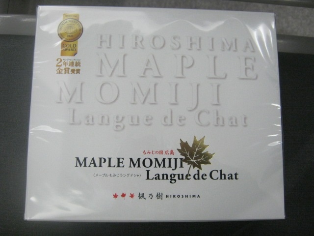 いつもお土産がもみじまんじゅう、というのもワンパターンかなと思い、今回はこちらのラングドシャを購入しました。試食で少し頂きましたが、爽やかな甘さで、もみじまんじゅうの餡子の甘さが苦手、という方への広島土産としても最適だと思います。モンドセレクションの金賞を二年連続受賞しているそうなので、世界的にも評価された味という安心感もあります。10個入りで702円でした。