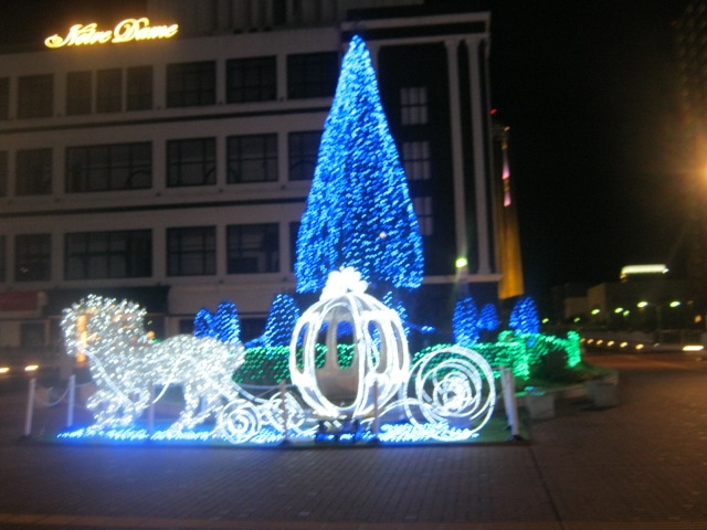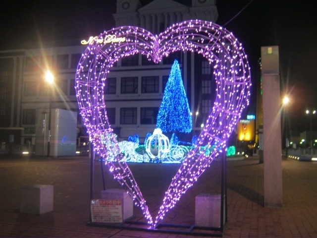 12月下旬のクリスマス時期に訪問しました。下関駅前の広々とした高架の空間を利用して設置されているイルミネーションですが、電飾が並ぶエリアはコンパクトにまとまっていますので、見物にはそれほど時間はかかりません。ハート型の電飾越しに、メインのイルミネーションを眺められるように配置されていました。