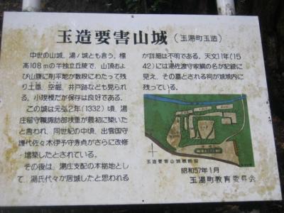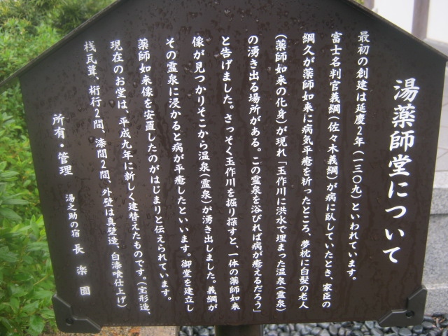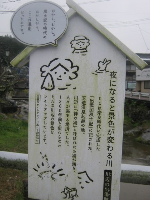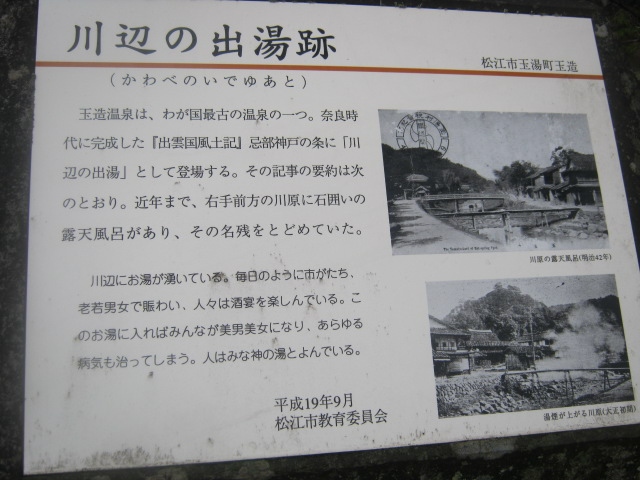 玉湯川沿いの宮橋手前にひっそりと看板が設置されていたので、何かなと思って拝見してみると、こちらの出湯跡でした。歴史的には、かつては河原に石囲いの露天風呂も設置されていたそうで、賑わいを見せていたそうですが、今はその遺構は残されておらず、解説板に付された写真などを見ながら、往時を偲ぶだけの場所になっています。