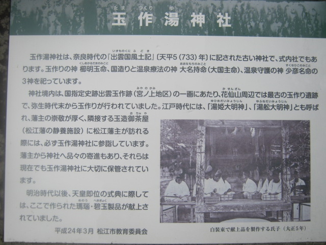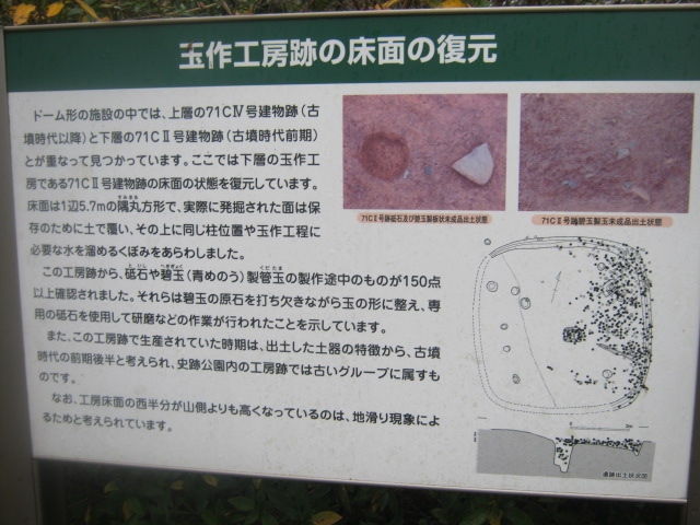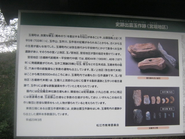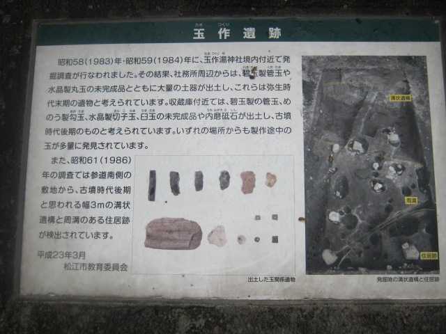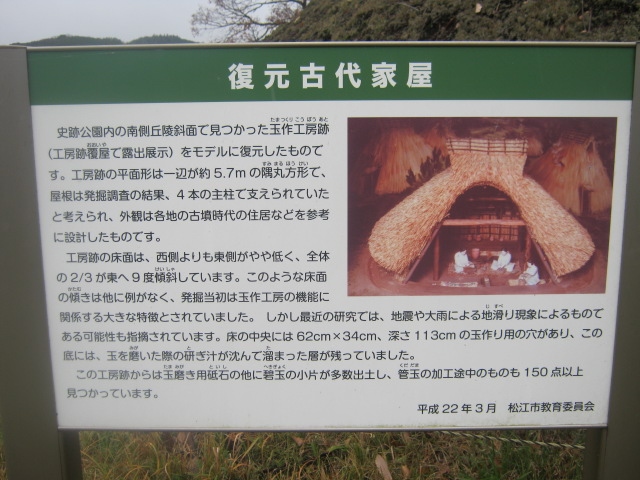 玉湯川沿いに続く玉造温泉街のメインエリアからは少し離れた高台の斜面に広がる公園で、全部を歩こうとするとかなり広くて見応えがある公園です。このエリアは文字通り”玉作り”で栄えた歴史を有していますが、そんな歴史を今に伝える遺跡としての細部の展示がこの公園内で色々と見られて、非常に興味深かったです。