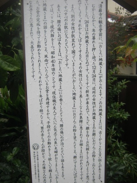 元々は顔に痣があったお坊さんが、お地蔵様におしろいを塗りつつ治癒を祈願したところ、それが治ったことに由来しているそうで、美肌を祈願する女性の方々を中心に信仰をあつめるようになりました。真っ白になったお地蔵様のお姿が印象的ですが、隣にいらっしゃる大師像の方も白くなっていて、どうやら間違って祈願されている方も多いのかな、という印象を受けました。- 旅行時期