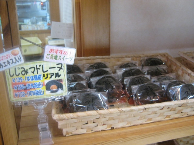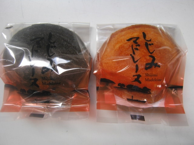 玉造温泉街の、足湯で有名な姫神広場のすぐ近くにあるお店です。お勧めを伺ったところ、数種類販売されているしじみマドレーヌとのことでしたので、私は”リアル”と”プレーン”の二種を購入してみました(各150円)。