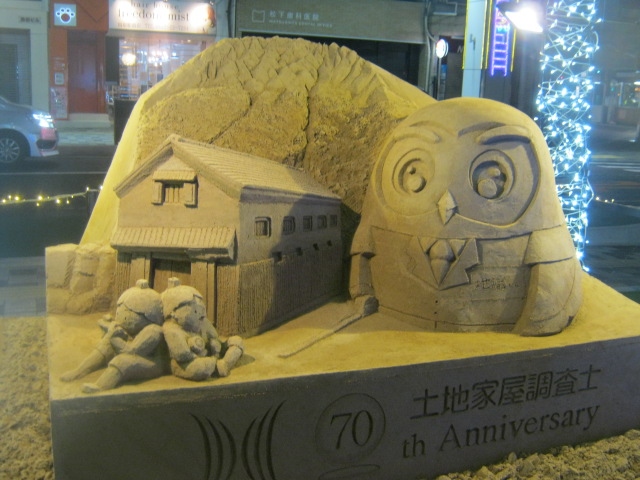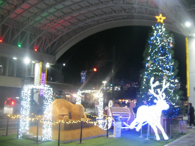 今回は夜間にこの百貨店の前を通りましたが、クリスマスシーズンということもあり、立派なツリーと可愛らしいトナカイさんのイルミネーションが輝いていて、とても温かい気持ちになりました。また、鳥取らしいなと思ったのは、このイルミネーションの傍には、砂丘の砂を用いたサンドアートも設置されていて、この美しい景観に更なる魅力を添えていて、とても良い思い出になりました。丁度、大丸の東側はアーケードのようになっていて、雨や雪を凌げるスペースになっていますので、休憩にも良い場所です。