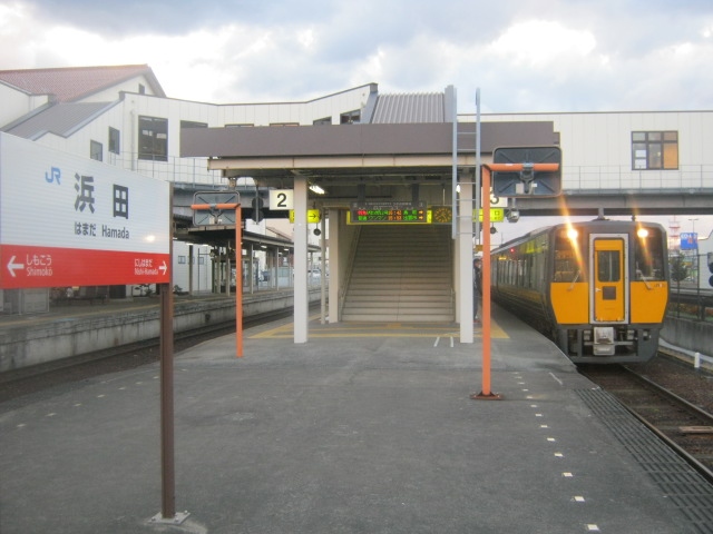 山口線まで延長運行している「スーパーおき」と同じ187系車両で運行されていますが、私は敢えてマイナーと思われる島根県域の最西部のみ(益田~浜田間)のみを乗車してみました。乗車時間帯や曜日にも依るのかと思いますが、始発の益田から乗車した際には自由席車両の乗客は自分を含めて二人しかおらず、この先、この区間での優等列車の運行が続くのかどうかが心配になってしまう程でした。