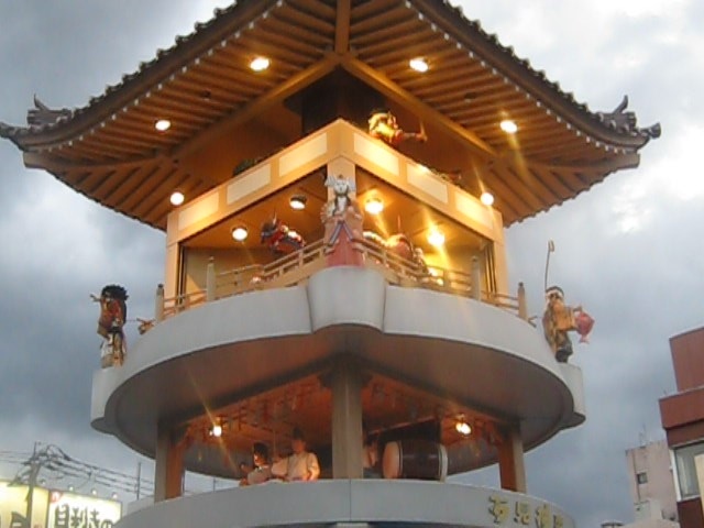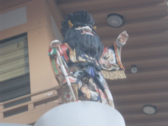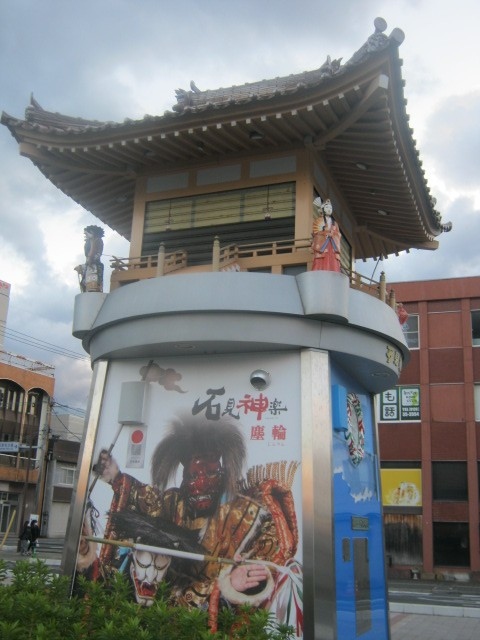 浜田駅前に設置されている、石見神楽を題材にしたからくり時計です。定時に作動すると伺っていたので、私は手元の時計を見ながら、17時を待ちましたが、その時刻になっても作動し始めませんでした。