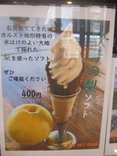 勿論、ジオパークセンターという名称通り、館内には秋吉台界隈の特異な自然環境に関する展示なども見られたりするのですが、私は”花より団子”で、カウンター脇で大々的に宣伝されていた「秋芳の梨ソフト」というのをオーダーしてみました。