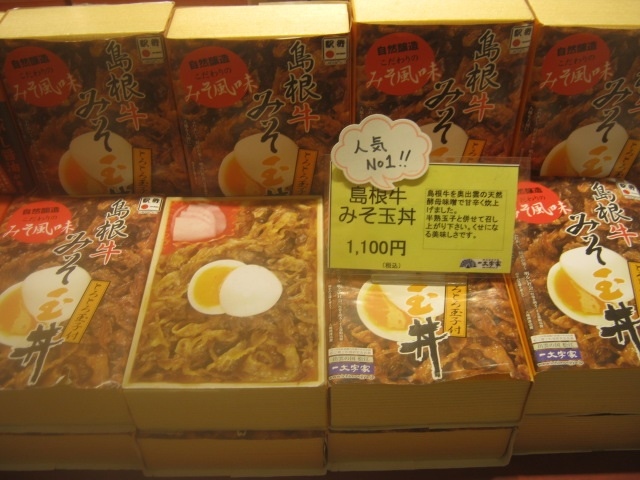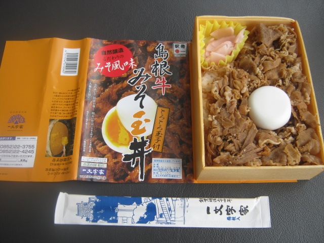 松江駅での駅弁といえばこちらのお店です。結構色々な種類の駅弁が販売されていますが、今回は久々の松江ということもありましたので、ド定番の「島根牛みそ玉丼」(1100円)を購入しました。伝統の製法で製造された芳醇な香りのお味噌をベースにした島根牛の味は絶品ですので、一度食べるとまた食べたくなります。