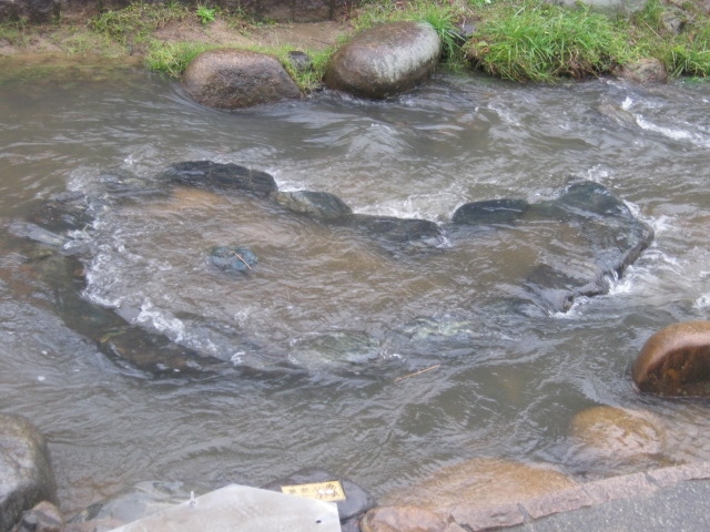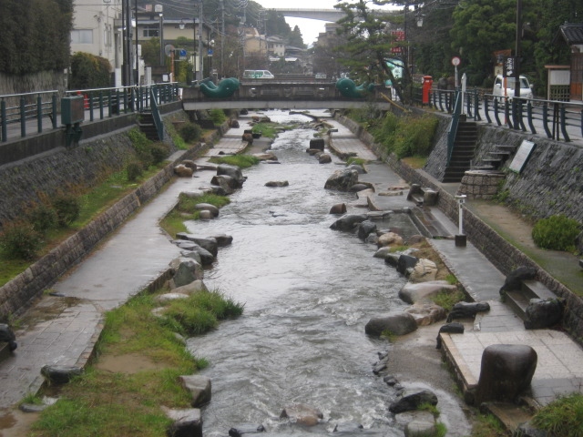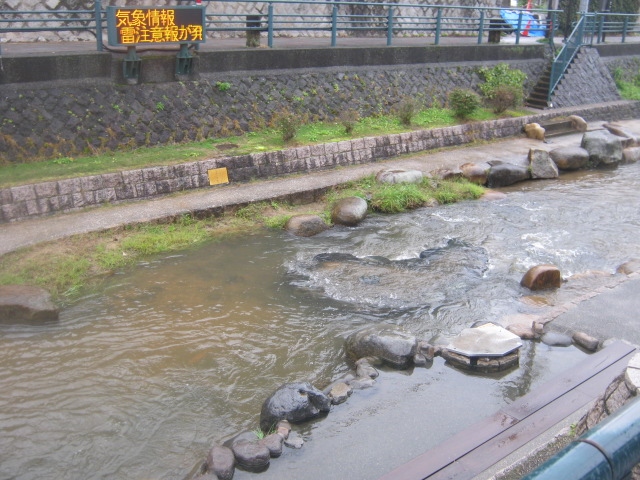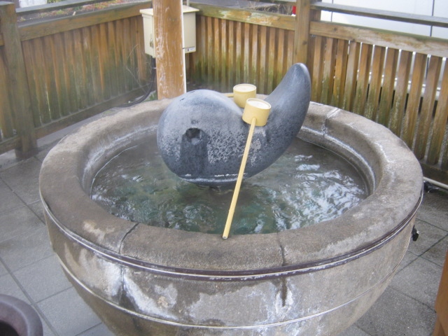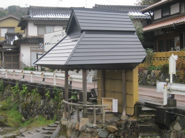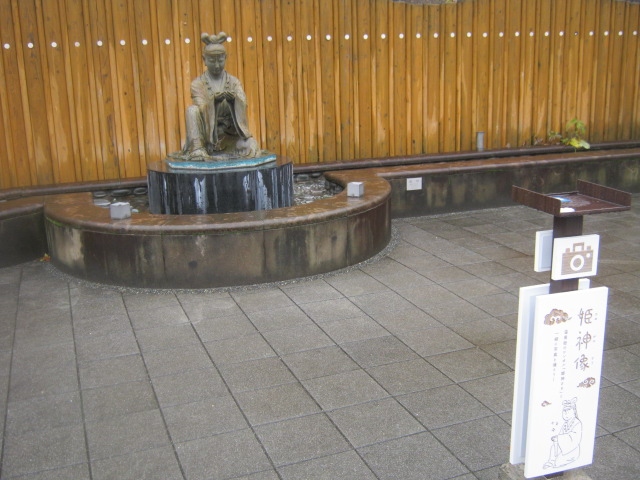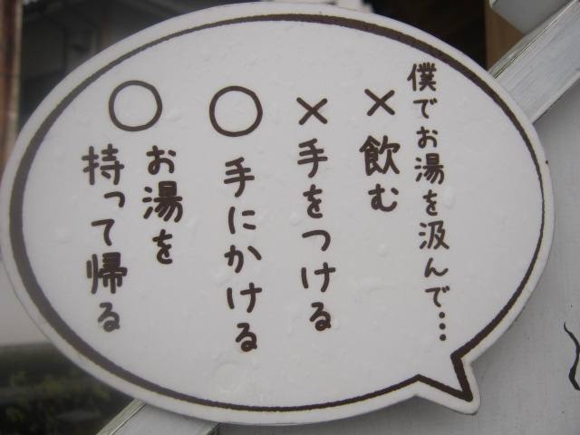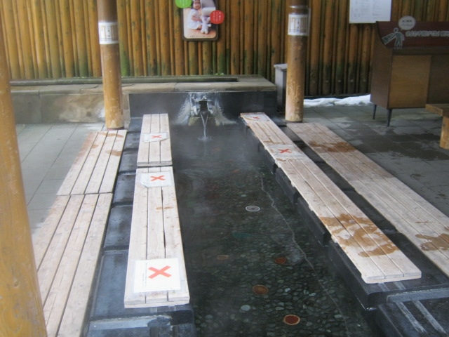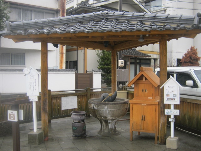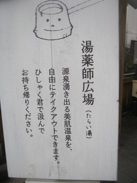 玉造温泉街にある小さな広場で、文字通り、中央部に柄杓が置かれたたらい湯が設置されています。ただ、このたらい湯は所謂”手湯”のように、浸けて楽しむタイプではないらしく、柄杓でかけて利用して下さい、との注意書きが付されていました。更に、飲用ともならないようでしたので、間違えてお口に含んでしまわないようにご注意下さい。利用は無料です。