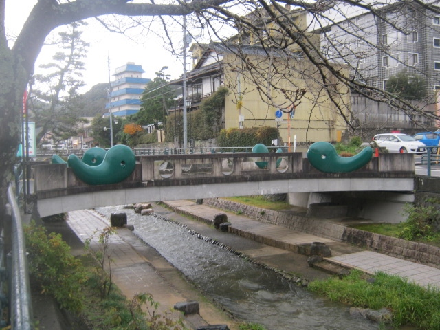 大きな緑色の勾玉を配したデザインになっている橋で、玉造温泉のガイドブックやパンフレットにもよく採用されている、被写体としてもとても映える温泉街のランドマークとなっている橋です。橋自体はそれほど長くもなく、すぐに渡れる幅ですので、色々な角度から好みのショットで撮影されると良いかなと思います。