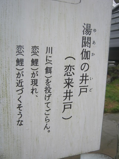 玉湯川を望む宮橋手前の一角に、小さな建物があったので、何かなと思って訪問してみたらこちらの井戸でした。正確な謂れはよく解らないのですが、どうやら、ここから鯉に餌をあげると、恋が叶う、という怪しげな謂れがあるようで、「恋叶の素」と称した鯉の餌が、一袋100円で販売されていました。