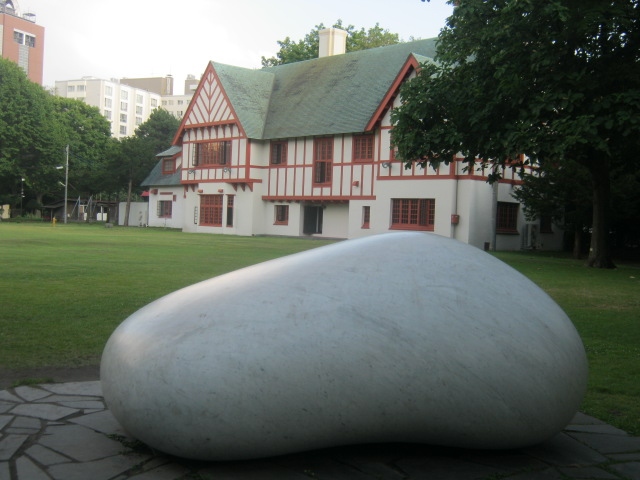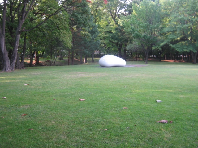 上述の作品が、人が多く集まるところにあるのに対して、こちらの作品は知事公館の中庭にひっそりと置かれている感じで、周囲の雰囲気が対照的で、流線型の丸みを帯びた恐竜の卵のような形状のこちらの作品は、とても癒し系の作風なので、中庭散策のついでに、安らかな気持ちで眺めると良い作品だといえるでしょう。- 旅行時期