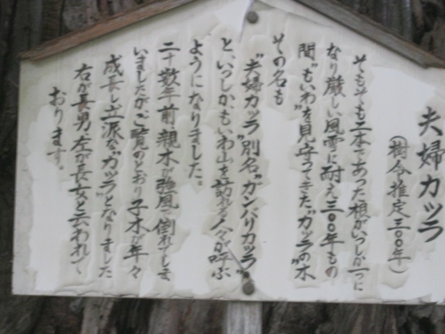 あと、この広場の脇には、実はもう一つ見所があり、それが「夫婦カツラ」と称する、二本の桂の木です。ただ、親木に関しては、既に倒木してしまったようで、現在見られるのは子木とのことでしたが、それぞれが命を受け継いだ長男・長女として年々すくすくと育っているそうです。何だか、和男・延男親子の脇で、お二方の偉業を祝福するかのような生命力にも思われて、今後の成長も眺めていきたいな、と、ホッコリした気持ちになりました。- 旅行時期