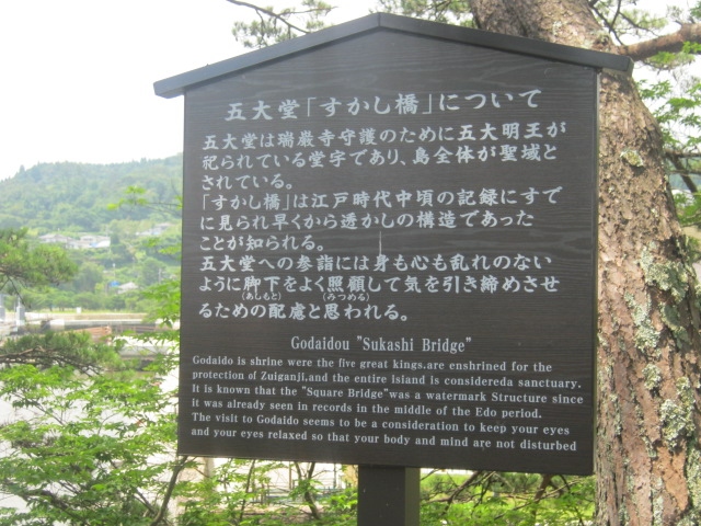 ただ、小島に建つような五大堂参詣に際しては、途中で下が透かして見えるようになっている「すかし橋」を渡らなければならず、四国の祖谷のかずら橋を彷彿とさせるような、下部が見えてしまうスリルは、観光での訪問とは言えども、気が引き締まる思いでした。