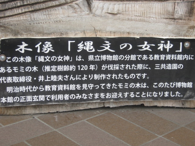 入口のところには、この「縄文の女神」を模った、立派な木製の”土偶”も設置されていますが、これは県立博物館の分館の教育資料館にあったモミの木が伐採された際に制作されたそうで、現在では、博物館を見守る番人のような存在感で訪れる人を楽しませてくれていますので、こちらも必見です。- 旅行時期