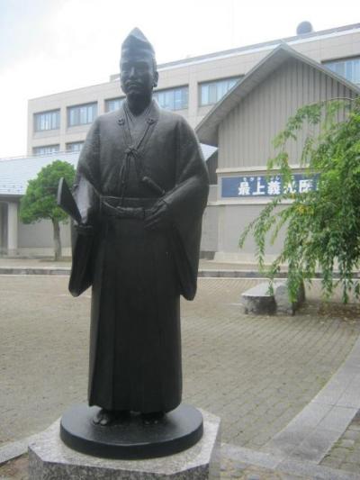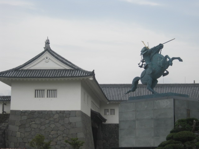 山形城跡公園として知られる霞城公園内の、近年立派に復元された二ノ丸東大手門を守るかのように威風堂々と建つ像がこちらです。
