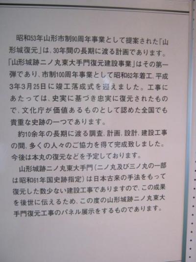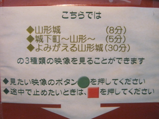 それぞれの展示物も非常に興味深かったですが、私は山形城の概観を解説したビデオがとても分かりやすくて勉強になりました。本当はこのビデオの中に、一連の山形城の復元作業に関する作品もあったので、これも観たかったのですが、放映時間が30分もかかるとのことで、今回は諦めてしまいました。是非、この作品も観賞するために、ここでは長めの時間を確保して、築城当時から現在、更には未来に向かう山形城の姿を包括的に追いかけてみて下さい。- 旅行時期