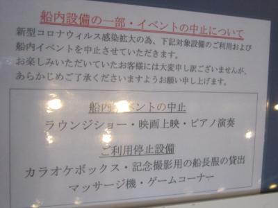 コロナ禍の中で、同社がどのような対応をしているのかも気になったのですが、まず、太平洋フェリーの一つの売りと言える船内イベント(ラウンジショー)や映画上映は中止されていましたし、ゲームコーナーやマッサージ機も使用禁止となっていて、事前に予想されたとはいえ、少し寂しい思いをしました。