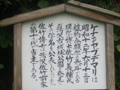 その力水の上方に何やら木製の立て看板が設置されていて、何かなと思って読んでみると、どうやらここで発見されたケナシヤブデマリという貴重な植物であることを記したものでした。園内で休憩がてら、是非、こちらの立て看板にもご注目してみて下さい。