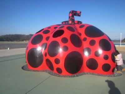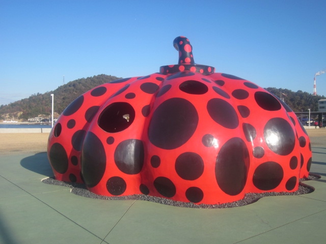 瀬戸内国際芸術祭が始まって以降、アートの島としてすっかり定着した感のある直島の中でも、特に有名な作品がこちらでしょう。今や直島のみならず、芸術祭全体のパンフなどでも表紙を飾るほど有名な、あの草間彌生氏の作品ですので、誰もがご存知かと思いますが、やはり現地で実物を見ると感動が違いました。