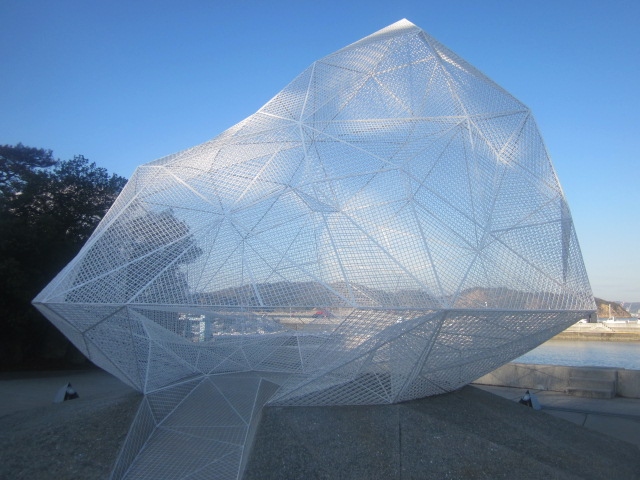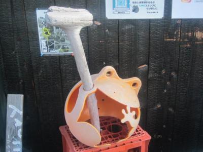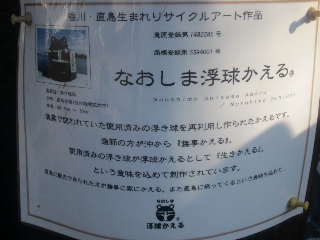 この島は2010年以降、3年に一度開催されている瀬戸内国際芸術祭の主要な舞台となっていて、有名な草間彌生氏のかぼちゃの作品など、屋外にも沢山のアート作品が点在していて、それらを巡る観光が現在では主流となっていますが、カエル好きな私が今回一番注目したのは、浮球かえるプロジェクトというもので、これは、漁具として使用する浮球のリサイクルを目的に、色々なカエルさんの形に加工してアート作品にしてしまう、という試みで、島内では幾つかのお店や郵便局の前などに、可愛らしいカエルさんの姿を沢山見かけることが出来ました。訪れる人によりアートの嗜好も様々だと思いますが、この島には多様なアートが存在していて、しかもそれらが日進月歩で進化している印象も受けますので、その時点におけるホットなアート探訪などを楽しまれるのが、この島でのお勧めの敢行スタイルと言えるのではないでしょうか。