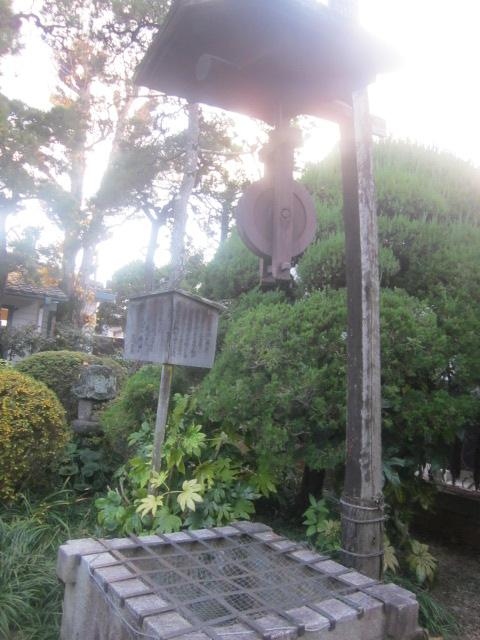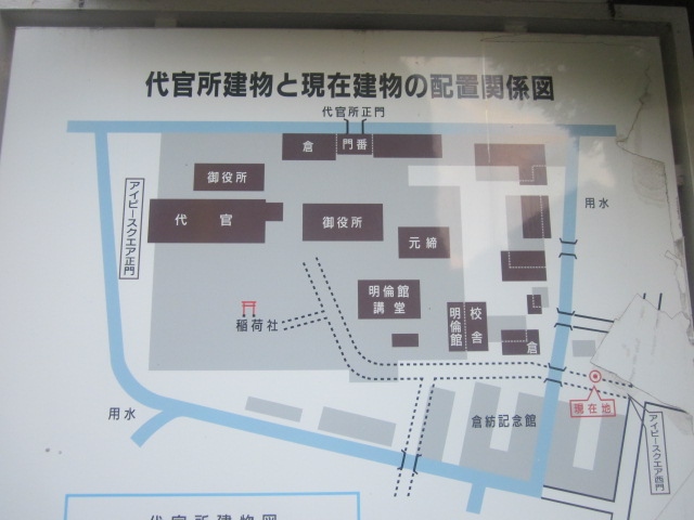 アイビースクエア内は江戸期には代官所があった場所として知られていますが、その後は倉紡工場が置かれたこともあり、往時の代官所としての風情は殆ど残されていませんが、すぐ近くの内濠遺構と共に、当時を物語る貴重な井戸となっていますので、是非足を留めて眺めてみて下さい。近くに建っている木製案内板は、既に薄汚れて読み辛い状態だったのも、ちょっと残念に感じました。