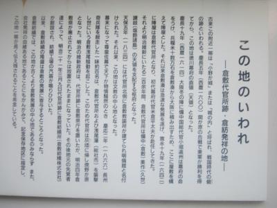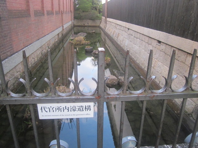 元々の倉敷代官所跡は、倉紡の工場時代を経て現在は観光地としての倉敷アイビースクエアに整備されるに至っていますが、その中で、代官所時代の貴重な遺構として現在も残されているのがこちらです。倉紡記念館の建物に寄り添うように、水路のようなものが見られますので、注目してみて下さい。一応、遺構を示す名称プレートが付された柵越しに、水路の様子を眺めることが出来ますが、観光客の方々の動線を見ていると、足を留めてみている人は殆ど見かけませんでした…。せめて、読み応えのある解説板とかを近くに設置して欲しいなと思ってしまいました。