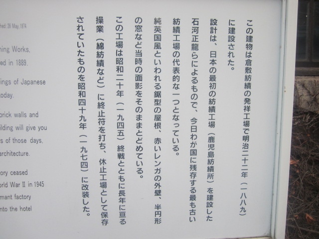 倉敷アイビースクエア内のメイン建造物の一つといえばこちらになるかと思います。クラボウの発祥の工場跡地ということですが、建てられたのは明治22年とのことで、アイビー(ツタ)が絡まる風情は、夏に訪問するとまさにその名の通り、という雰囲気が感じられると思いますが、私の訪問時は生憎の冬季でしたので、その名前に相応しい風情は感じることが出来ませんでした。