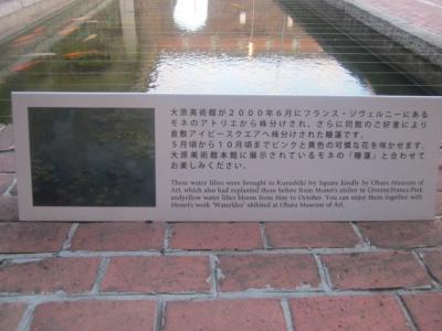 倉敷アイビースクエア内のほぼ中央、アイビー学館が取り囲んでいる中庭広場の一角にこちらを見つけました。私の訪問時は冬だったので、睡蓮の姿は残念ながら見られませんでしたが、解説を読むと、どうやら、フランスのモネのアトリエから、大原美術館に株分けされた睡蓮を、更に美術館のご厚意で、こちらのアイビースクエア内に株分けされたものだそうで、立派にモネのアトリエの遺伝子を引き継ぐ、貴重な睡蓮とのことでした。