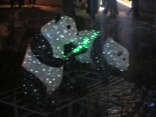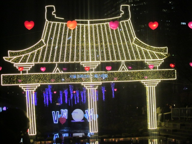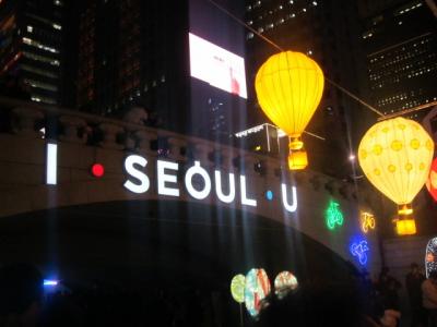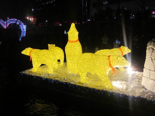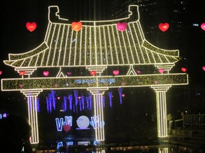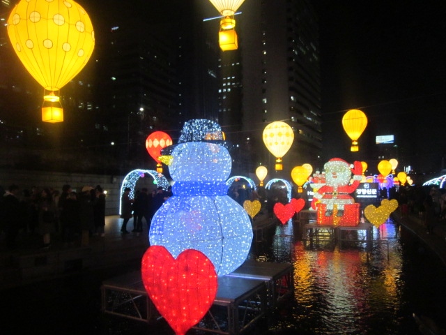 すると、想像を絶するような大混雑の中、原色系のイルミネーションが多数並んでいて、最近の日本の電飾は、LED系のお上品なのが多くなった印象なので、逆に新鮮に感じました。清渓川といえば、ランタンフェスティバルが有名だと思いますが、同じようなテイストで、原色系のド派手さを楽しむのに良いイルミネーションだと思います。