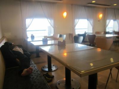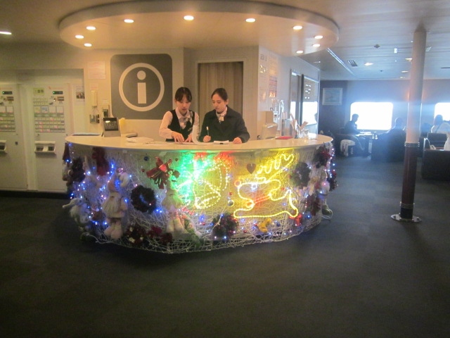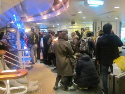 往路の博多→釜山は昼行便で、月曜日でしたが年末ということもあり結構な混雑でした。こちらに関しては明るい時間帯を航行するために、船旅の途上で海の景観を終始楽しめる良さがある一方で、釜山には夕刻に到着してしまうため、当日の宿を確保しておく必要があります。(私の場合は夜行列車利用でソウル入りしましたので、宿は取りませんでしたが…。)