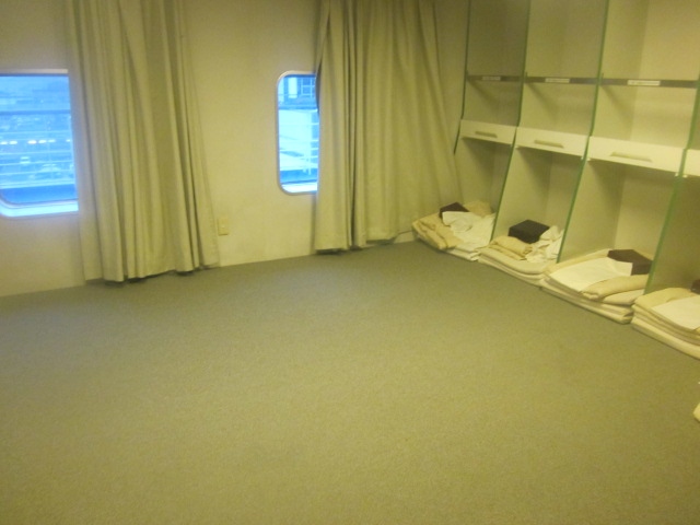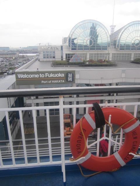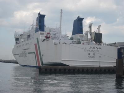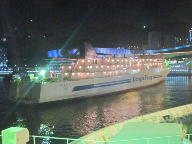 ただ、この時間が実は船旅好きな方には結構お勧めで、現行のタイムスケジュールでは、先行する関釜フェリーの出航(21時発)の様子をカメリアラインの船内から楽しむことが出来たりします。ただ、出航後はひたすら闇の中を航行しますので、船旅の途上で景色を楽しみたいという方には向かない便かもしれませんね。この便に関しては、博多に到着するのも朝6時頃なんですが、実際に入国審査場に進めるのは7時半からとなっていますので、ここでも1時間半のタイムラグがあり、所要時間としては、20~翌7時半ということで、11時間半もかかる、という計算になりますね。往路が12時半発18時着の所要5時間半なので、この往復の差も、カメリアラインのある意味魅力の一つかなと思います。