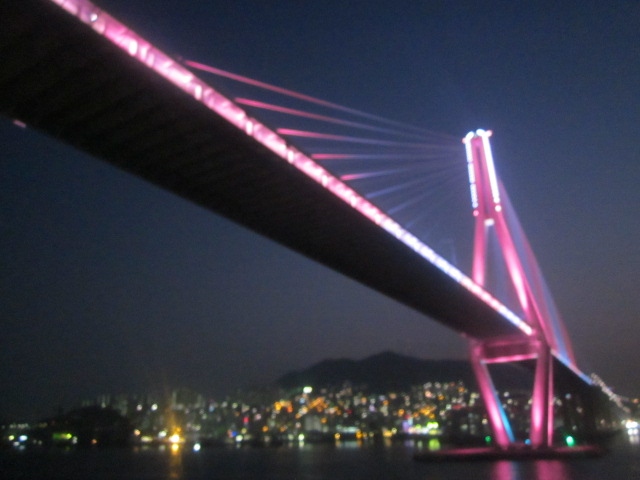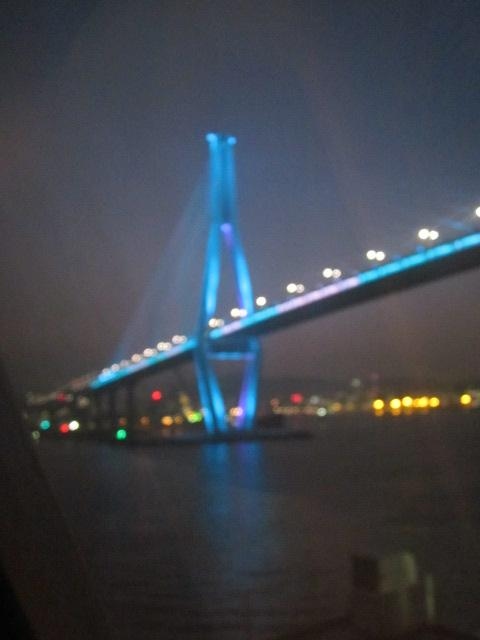 冬の一番日の短い時期、ということで、博多→釜山(18時着)の入港10分前位に通過するこの橋の辺りでは既に夜景モードで、刻一刻と色合いが変化する橋の様子にうっとりとしながら、素晴らしい船旅のフィナーレとなりました。