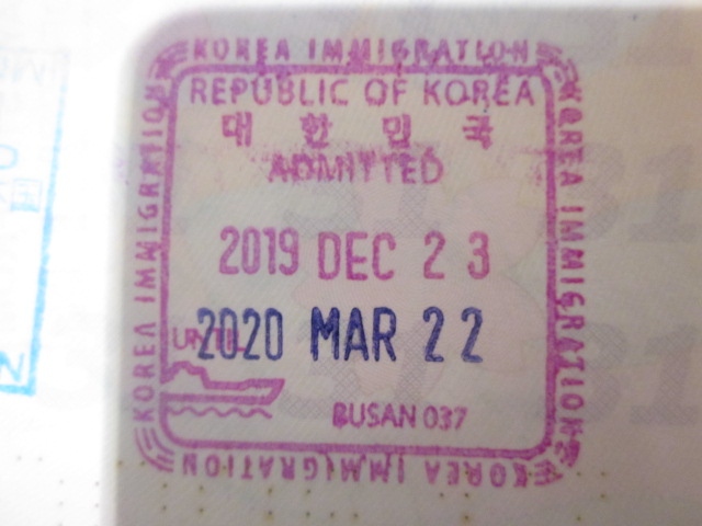 今回は博多からのカメリアラインを利用してこちらに到着しました。昨今の世界的な流れで、韓国入国時も、金浦空港などは入国スタンプが省略されるようになってしまった、という話を耳にしていて、今回はこれが令和初海外スタンプとなる旅程だったので、絶対に省略されてほしくないと思っていたところ、この時点では、まだ船入国を示すデザインの従来のスタンプを押してもらうことが出来ました。