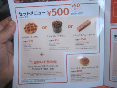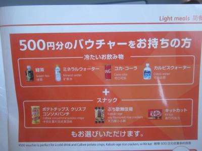 まず500円クーポンを何に使おうかと機内のメニュー表を見てみてびっくり。GK名物のジェッ太君どら焼きの単品販売額が400円に値上がりしていて、ホットドリンクのセット割として50円引きで丁度500円となるお得なメニューから対象外になっていました。
