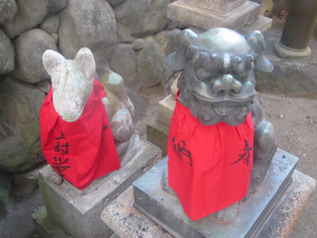 今回は、12月30日という、年末の慌ただしい時期に一足早い初詣的に訪問してみました。流石にこの日付ですので、周囲は初詣に向けての準備が忙しそうに続けられていました。そんな中を恐縮しながらの参拝でしたが、大きな狐さんとは別に、昔ながらの小さな狐さんと狛犬さんもいらして、この子達が赤い衣を纏っている姿がとても可愛らしかったです。