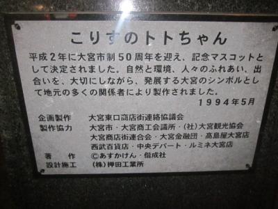 大宮駅東口側に直結した商店街ですが、観光客的視点からは、ここでは何といっても、こりすのトトちゃんの像が可愛くてお勧めです。大宮といえば、プロサッカークラブのアルディージャが有名だと思いますが、あの意味って、実はスペイン語でリスのことだったんですね。元々、旧大宮市のキャラクターがリスだったということで、大宮の方にとってのリスに対する愛情が存分に感じられる像だと思います。因みに、商店街内ではアルディージャの選手の足形(サッカー関連だから足形)が飾られている個所もありますので、ファンの方はお目当ての選手を探して歩いてみる、というのもお勧めです。