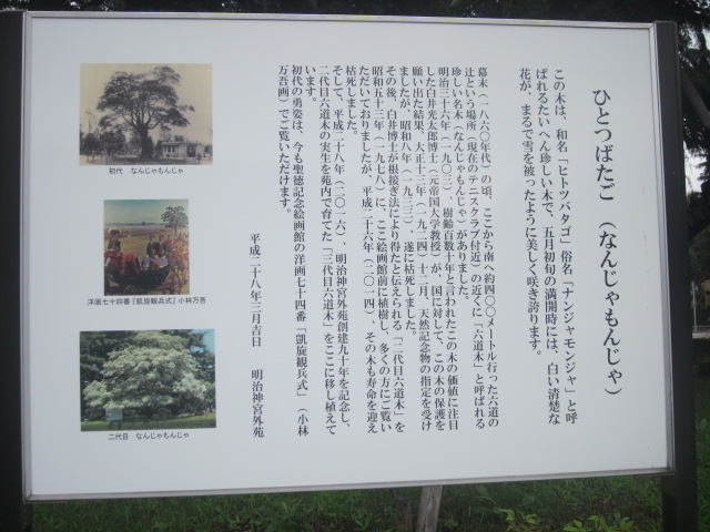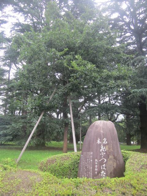 神宮外苑内の聖徳記念絵画館脇にひっそりと佇んでいるのがこちらの木です。元々は白井光太郎博士が、この木の希少性を主張し、天然記念物指定を勝ち取るまでに至った、由緒ある銘木だったようですが、昭和8年に残念ながら枯死してしまったようです。その後、根接ぎにより復活した二代目の株が昭和53年に植樹され、割と最近(平成26年)まで現存していたそうですが、これも枯死してしまいました。