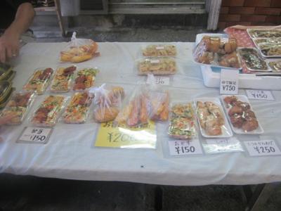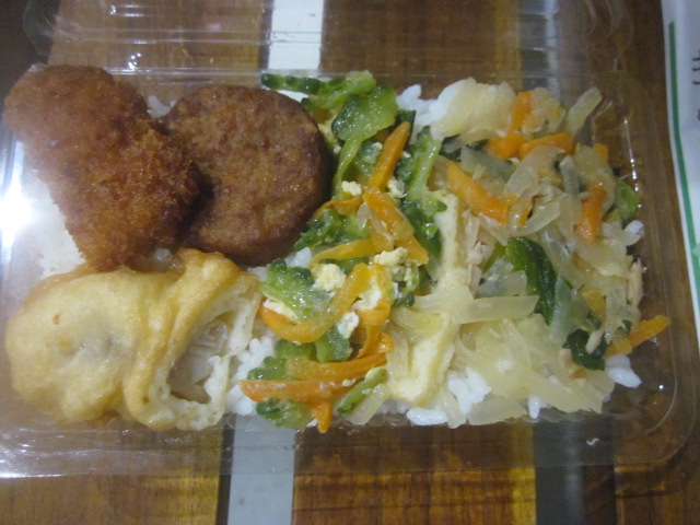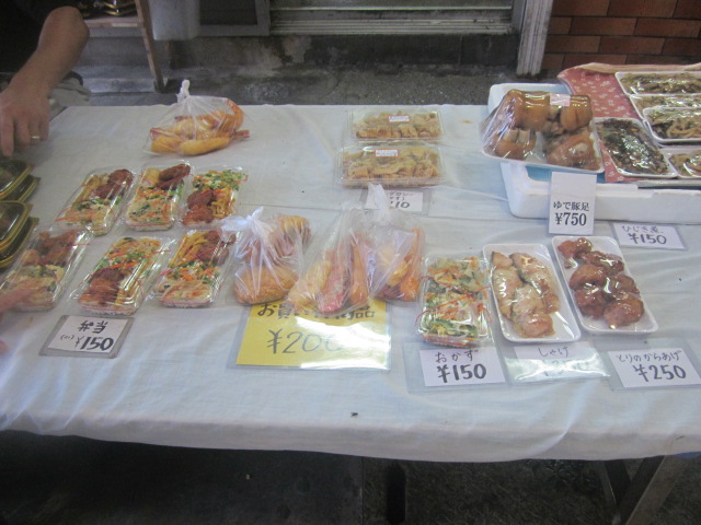 夏の夕刻に訪問しましたが、やはり傷みやすい時期ということもあって、早く売ってしまいたいらしく、沖縄らしい豪快な盛り付けのお弁当が150円で販売されていて、これをゲットしました。他にもてんぷらのまとめ売りとか、サーターアンダギーみたいなのとか、まさにおもちゃ箱のような雑多な販売方法が古き良き時代の那覇の商店街の風情を色濃く残しています。- 旅行時期