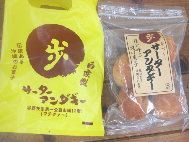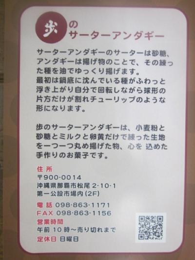 第一牧志公設市場の2Fにあった店舗ですが、2019年7月現在、元第二牧志公設市場跡地にて、他店舗と同様、仮設店舗にて営業しています。すぐ傍にある歩のサーターアンダギーは最低5個入からとなりますが、ここはばら売りもしていて、味も4つありますので、小腹が空いたときにちょっとだけ、とか、いろんな味を試してみたい、という方にお勧めです。ここはサーターアンダギー専門店ではなく、他のスイーツも販売していて、イートインのような箇所もありますので、飲み物と共にオーダーして、イートインで休憩しながら頂く、というのが良い店舗です。